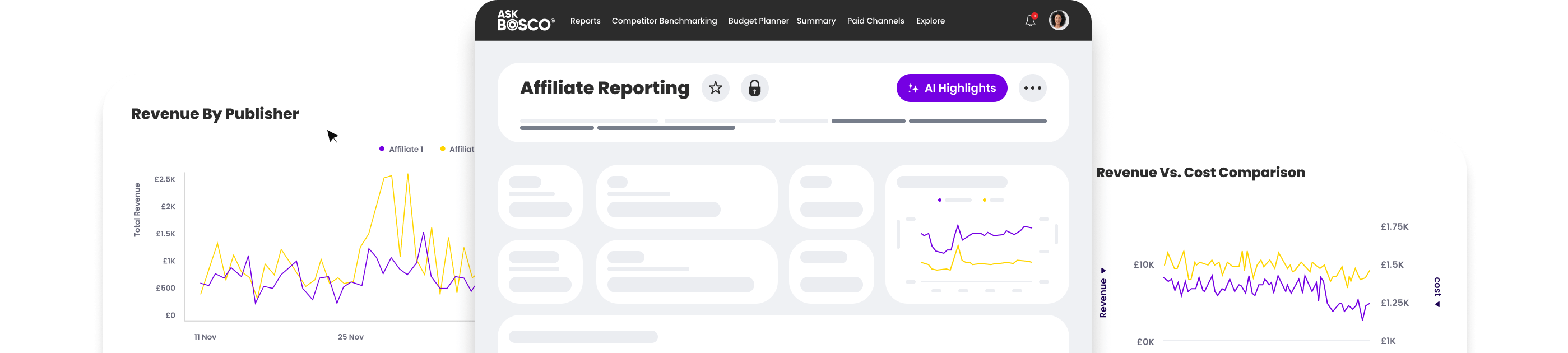 ASK BOSCO® collates all of your data from all your analytics tools into a single, customizable affiliate report, streamlining your reporting process and enabling you to uncover actionable, data-driven insights faster.
