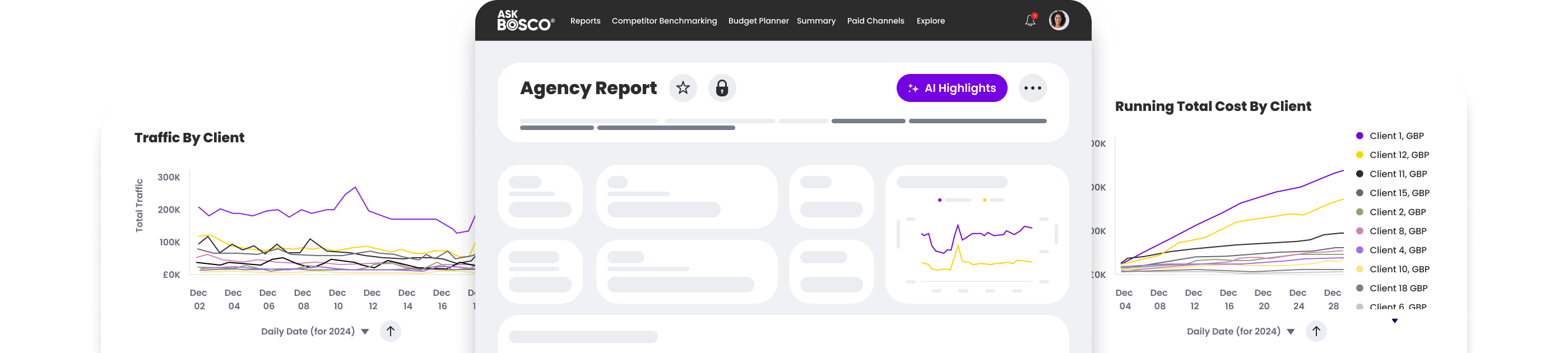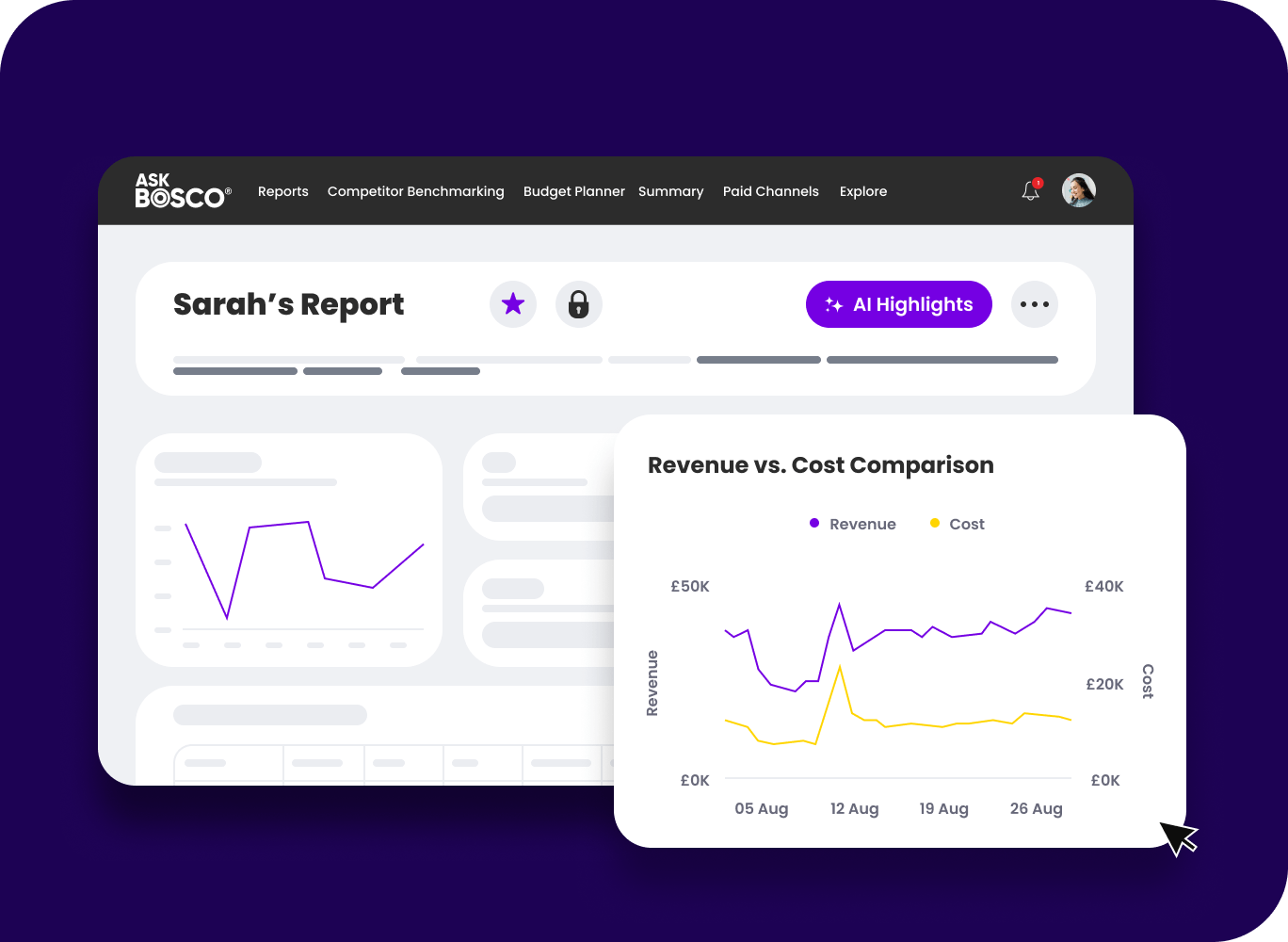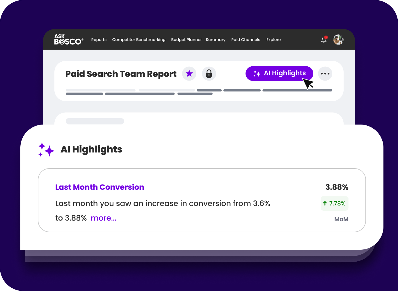 ASK BOSCO®’s AI assistant uses natural AI language processing, delivering instant answers to your questions about your data. From top-performing paid campaigns to emerging trends, get insights in seconds, so you can make quick, informed decisions that lead to the best results. Also, gain instant AI highlights at the click of a button to understand data and produce commentary for weekly, monthly or quarterly reports.
