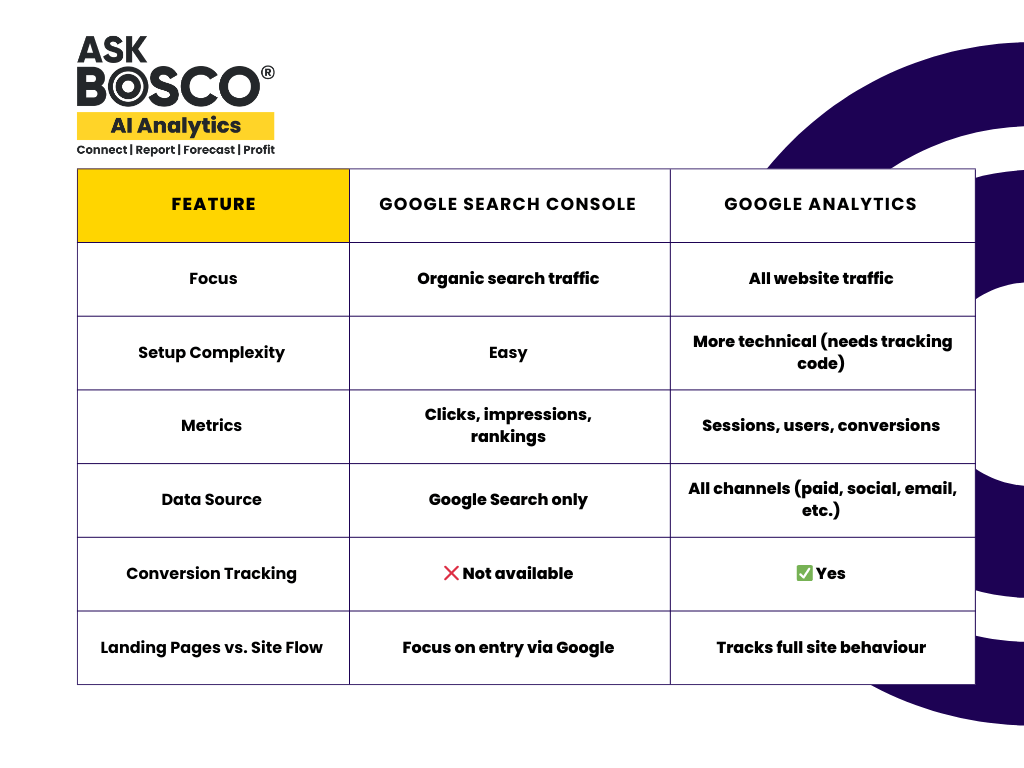 TLDR: When it comes to website performance analysis, GSC (Google Search Console) focuses on SEO metrics, providing insights into how a website appears in Google Search, including data on impressions, clicks, and keyword rankings. It helps identify which queries bring users to the site and ensures content is properly indexed. Alongside this you need GA4, which tracks user behaviour on your website, offering information on how visitors arrive, be it through organic search, paid ads, or social media – and what actions they take, such as page views and conversions. By integrating both tools, users gain a comprehensive view of their website’s performance, from search visibility to user engagement, enabling more informed optimisation strategies.