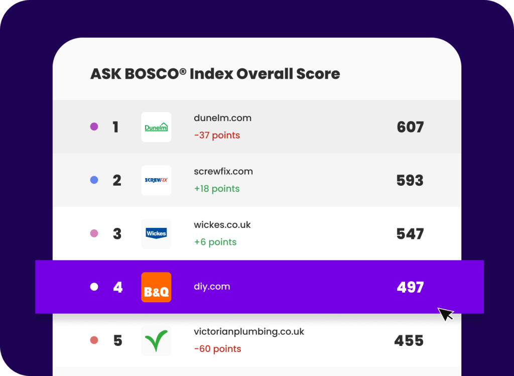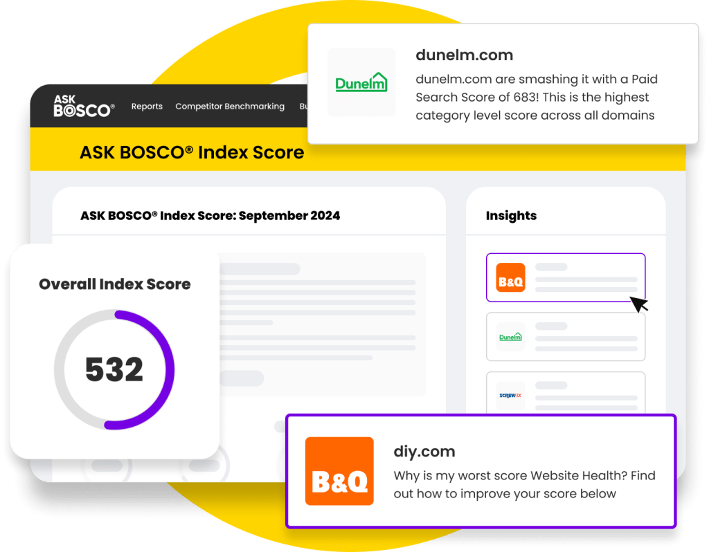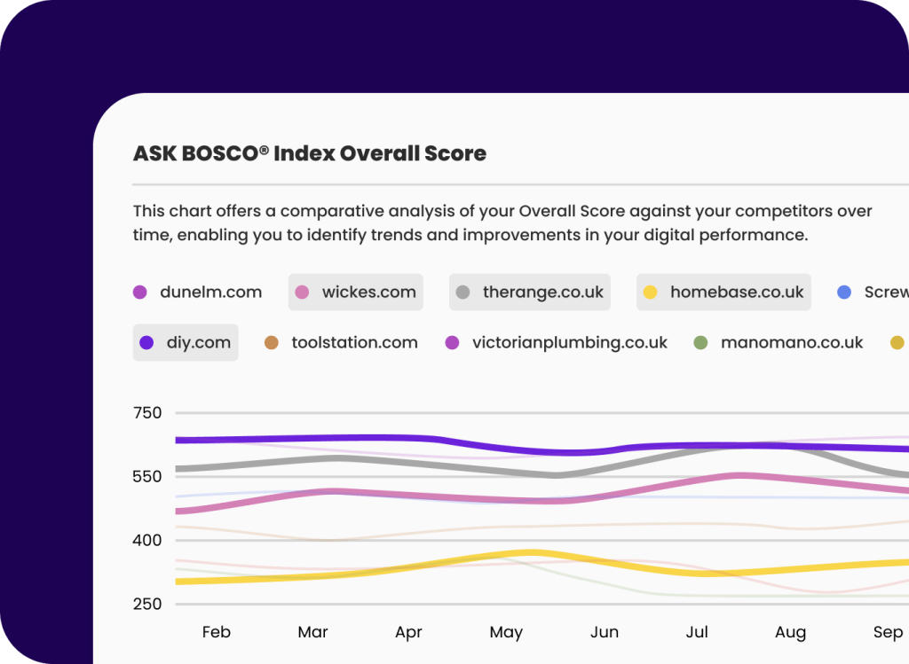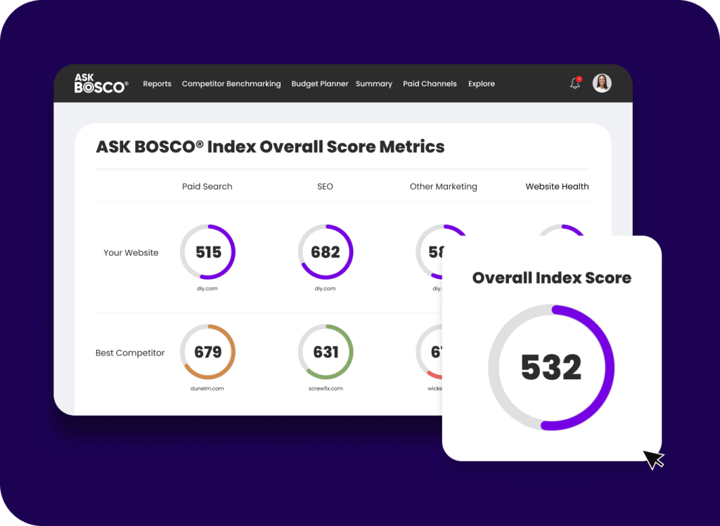 The ASK BOSCO® Index is the competitive scoring system within the ASK BOSCO® Competitor Benchmarking feature that allows you to compare your online performance against the competitors within your sector. Think of it as the credit score of digital marketing.