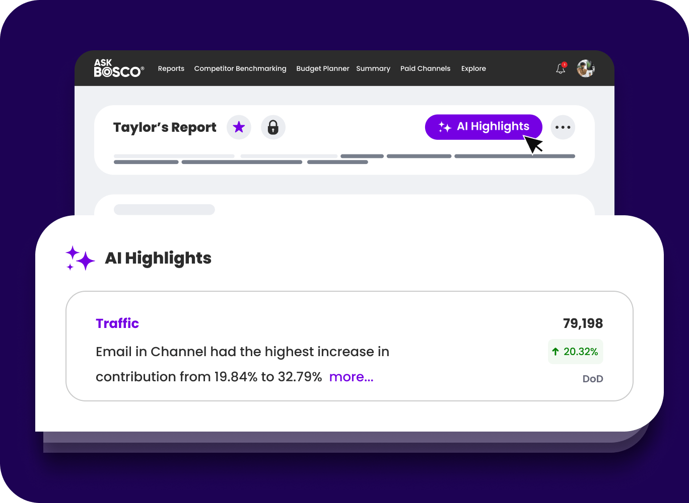 Optimize your Awin spend using ASK BOSCO®’s AI insights. Simply ask your data which campaigns are delivering the best performance and get answers almost immediately. Our AI highlights provide detailed analytics so you can understand your data without spending hours trawling through spreadsheets.