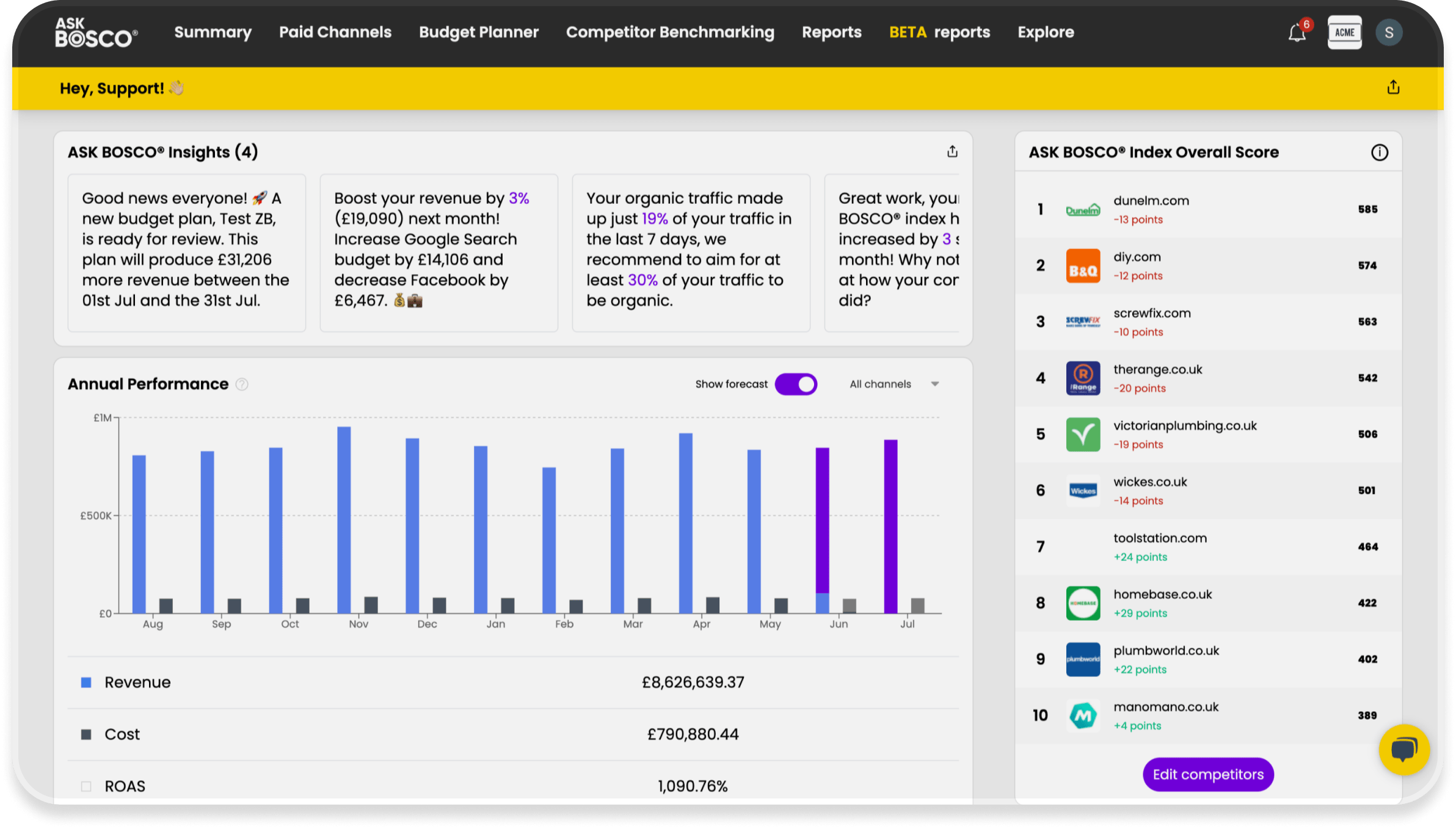 ASK BOSCO® leverages the latest AI technology for both reporting and forecasting. You can interrogate your data with the AI-powered search functionality in our reporting suite by simply typing in a question or key term for immediate answers - whether you’re after a summary of your top-performing campaigns or an update on marketing spend. Our AI budget planner allows you to make quick marketing decisions informed by data.