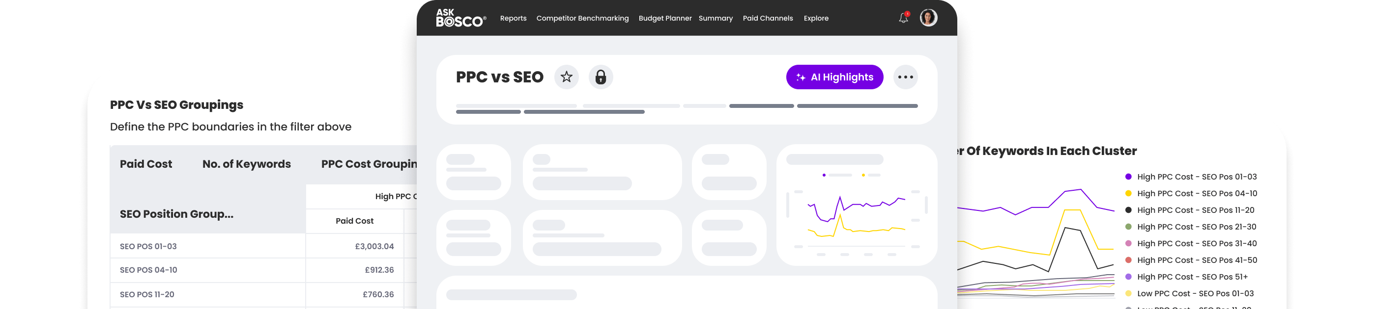 Streamline your marketing reporting with ASK BOSCO®. Alongside your PPC vs SEO report, you’ll find a whole host of expert-built reports, accurate budget forecasting and competitor benchmarking to save time and drive better decisions.