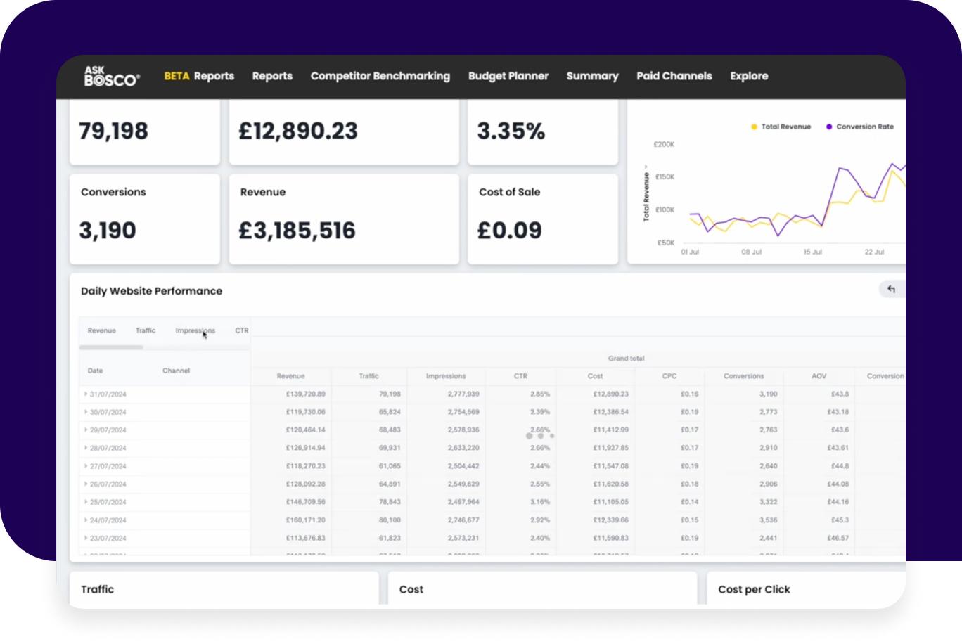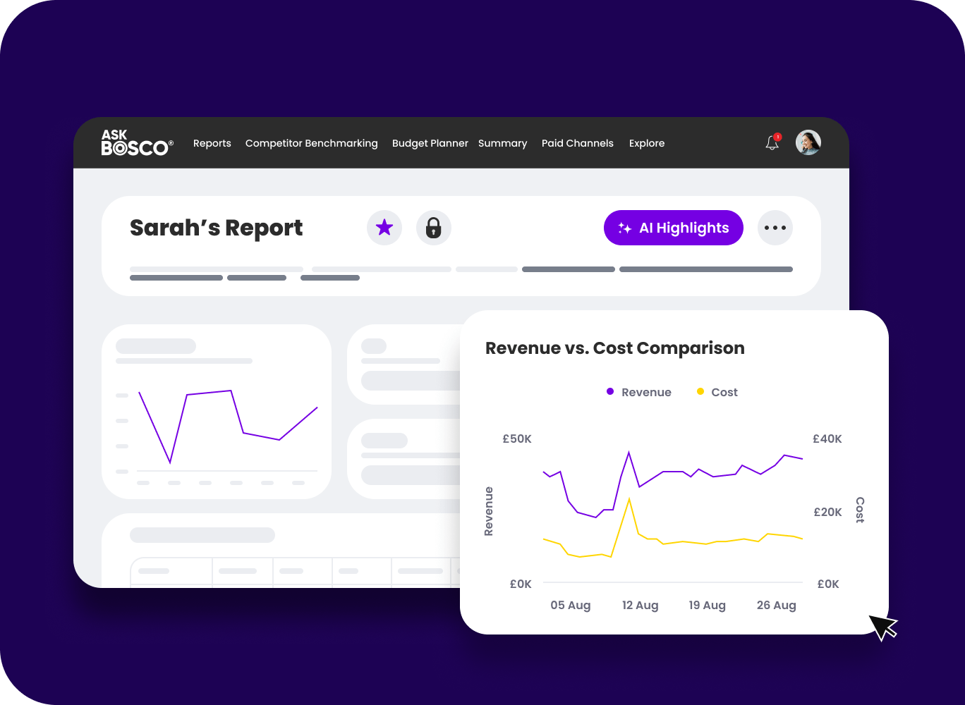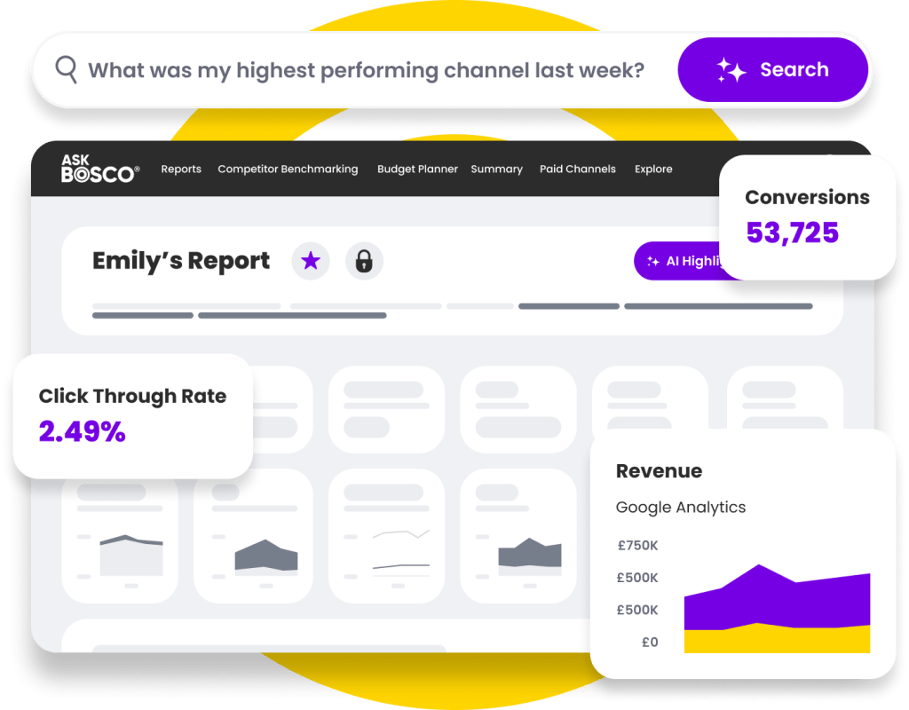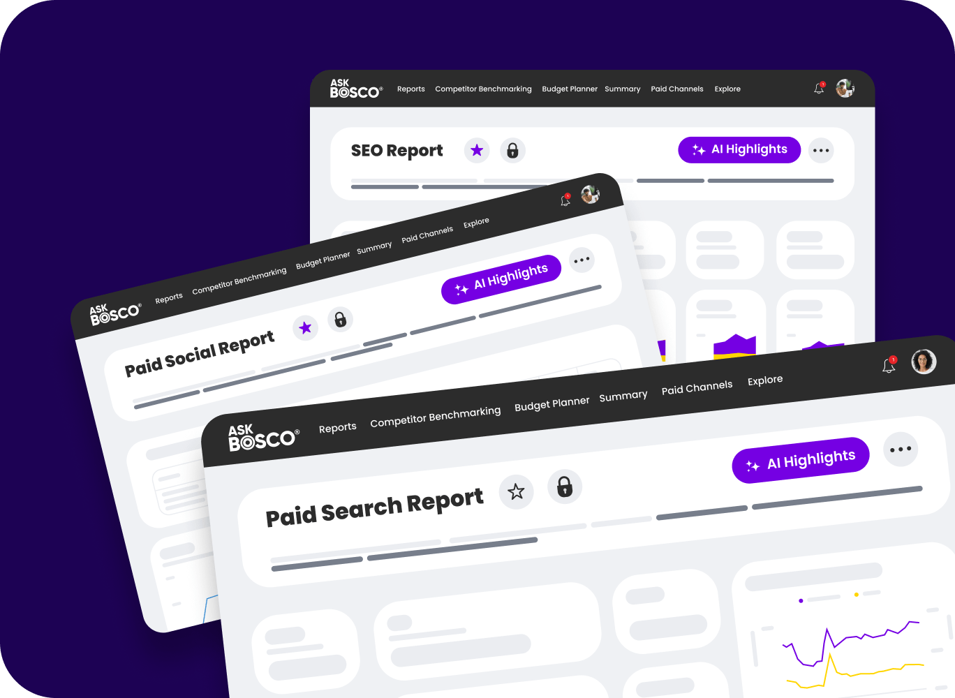 Still juggling multiple tools and spreadsheets for your marketing reporting? With the ASK BOSCO® AI Reporting Suite, you can create instant, accurate reports in seconds. All in one place. Save hours of time with pre-built reports, a customizable dashboard and Agentic AI to chat directly with your data.